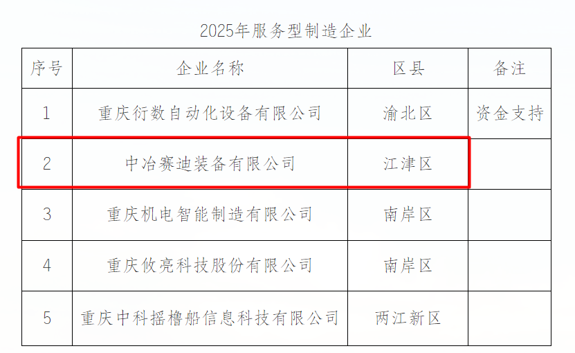 8月11日,中冶賽迪裝備申報的"綠色冶金與高端裝備服務(wù)型制造企業(yè)"通過重慶市經(jīng)濟和信息化委員會審批,成功入選重慶市2025年服務(wù)型制造企業(yè),這標志著中冶賽迪裝備在科技創(chuàng)新、研發(fā)中試、制造型服務(wù)業(yè)建設(shè)以及引領(lǐng)行業(yè)產(chǎn)業(yè)轉(zhuǎn)型升級方面,取得階段性成果。